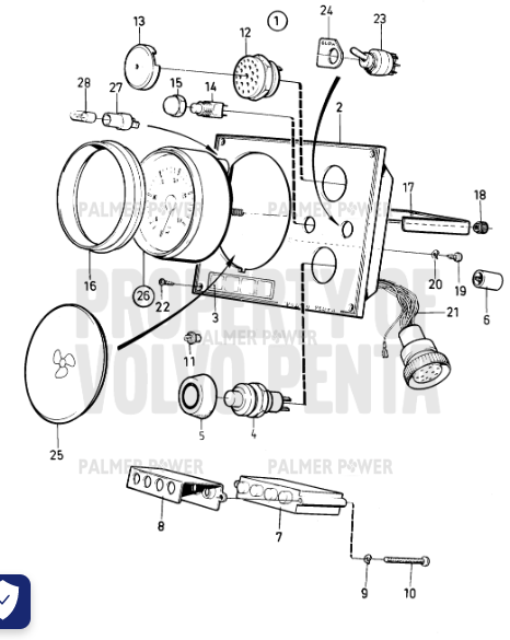 Product Description : Instrument Panel Part No. 873594 2 Instrument Panel Part No. 872798 3 Symbol Strip Part No. 858645 4 Button Part No. 843684 5 Rubber Cap Part No. 837533 6 Diode Part No. 20382270 State Key Code When Ordering, (1624394) 7 Electronic Unit Part No. 873737 8 Reflector Part No. 828784 9 Spring Washer Part No. 941904 10 Cross Recessed Screw Part No. 941615 11 Bulb Part No. 19923 12V 12 Buzzer Part No. 828587 13 Protecting Casing Part No. 858795 14 Toggle Switch Part No. 828585 Instr. Light 15 Nut Part No. 828586 16 Ring Part No. 873517 17 Brace Kit Part No. 873208 18 | Nut 19 Cross Recessed Screw Part No. 949947 20 Spring Washer Part No. 941904 21 Cable Kit Part No. 873560 22 Screw Part No. 828647 23 Toggle Switch Part No. 872800 24 Decal Part No. 872771